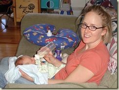 We went to the docs office today just to get an extra weight since Chase was so teeny tiny. So on Feb 4th, he weighed 5 lbs 11 oz. He was 18 1/4 long with a head circumference of 13.5. Today, Feb 11th he was 6 lbs 8.5 oz. No wonder we had to move up to the big bottles! Dang, that was fast! Look how big the bottle is!