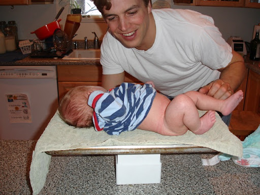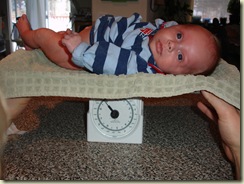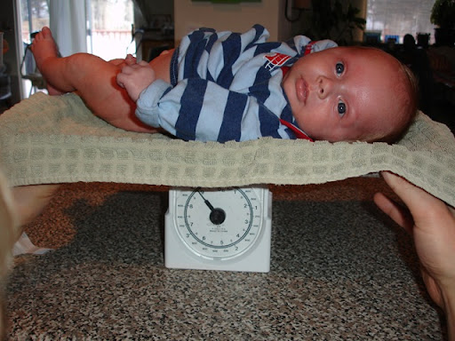 Daddy jerry-rigged his baby scale up again to see how big Chase is getting and once the little guy stopped wiggling around, it looks like he is packing in 8 pounds 14 ounces...just shy of 9 pounds - WOW!