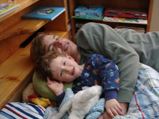 Here is Daddy and Tate cuddling on his bed.....poor little guy, he is still pretty pail...hopefully tomorrow his sweet red cheeks will be back!